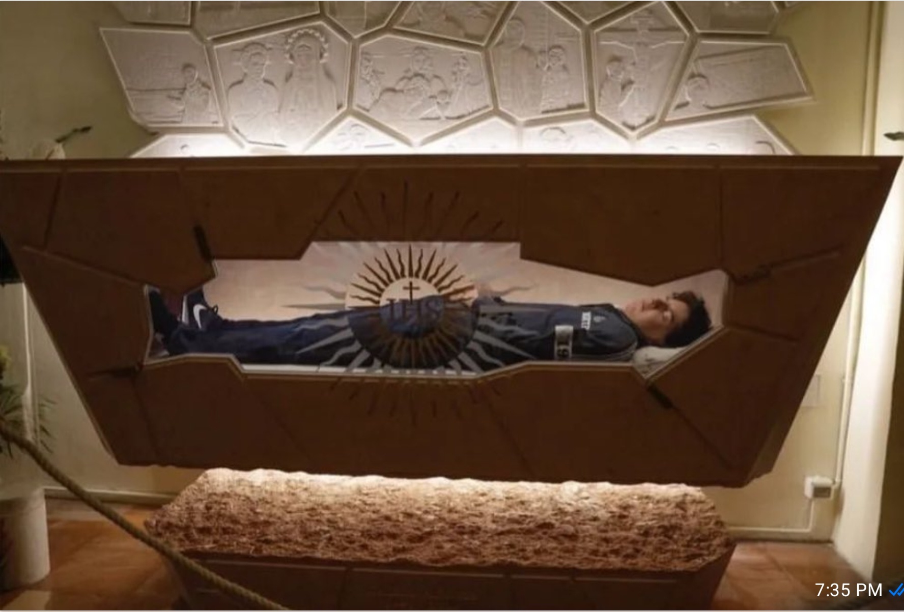 Panel batu di belakang peti mati menggambarkan adegan-adegan dari hidupnya dengan beberapa sentuhan simbolis. Pada salah satu panel, logo Facebook, Google, dan perusahaan internet lainnya mengapung di sekelilingnya. Carlo adalah orang suci pertama yang dimakamkan dengan perlengkapan bermerek.