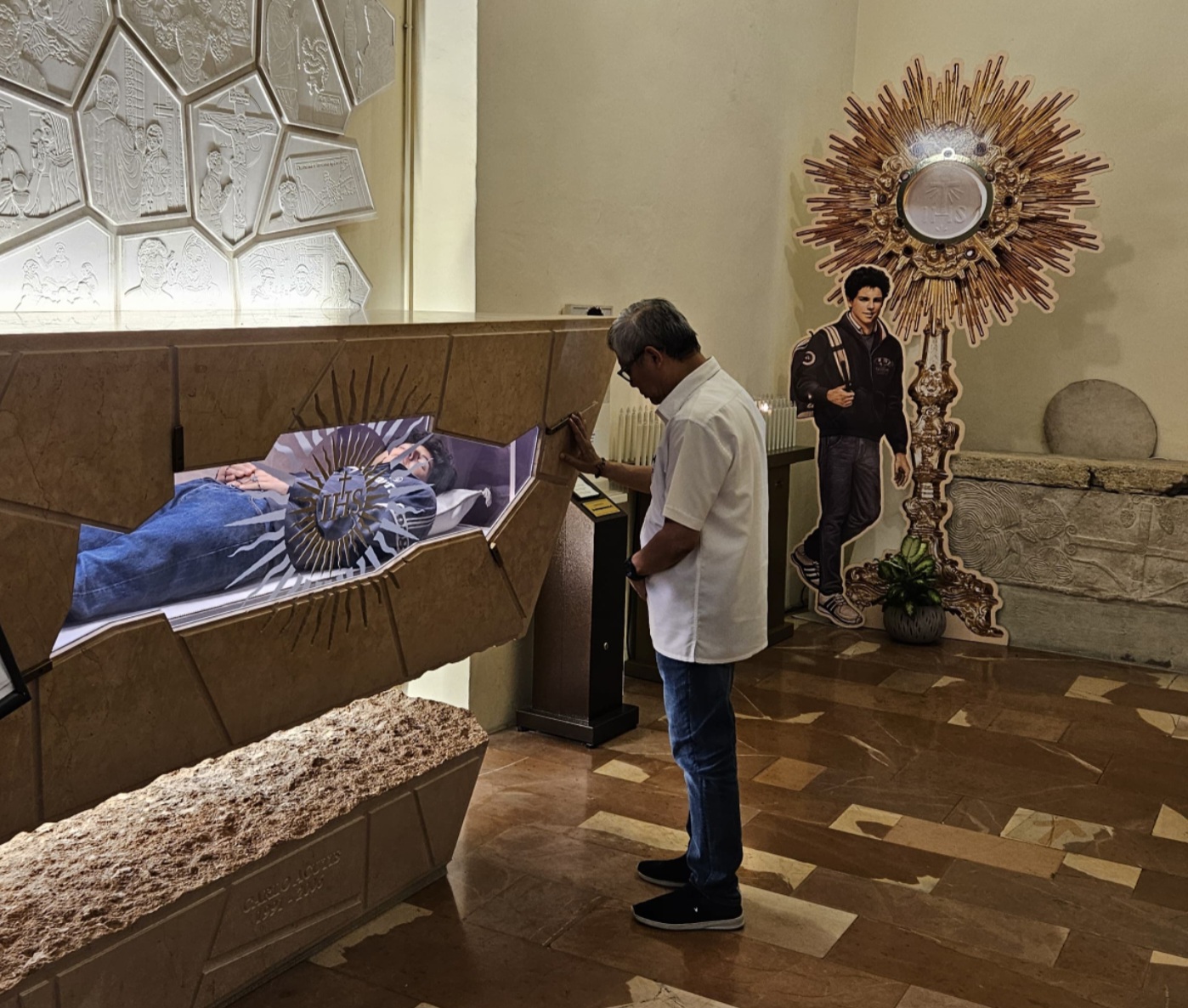 Di Gereja Santa Maria Maggiore, Asisi, jenazah Santo Acutis disemayamkan. Tubuh aslinya, terbungkus lilin, terbaring di dekatnya dalam peti mati berubin cerah dengan panel kaca di tengahnya. Ia berpakaian seperti anak seusianya, dengan kaos oblong, celana jin, jaket beritsleting, dan sepatu sneakers.